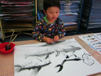 黒と白だけを用いて“光と影”を意識して表現する木炭画にチャレンジしました。テーマは「海の生き物」。木炭の性質を利用して形や陰影をつけていき、仕上げは墨汁をつけた割り箸ペンや、小筆を用いて細部を描いていきます。深海を泳ぐ魚たちの様子がユーモラスに描かれました。