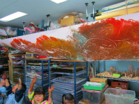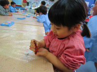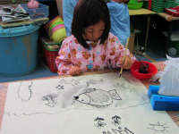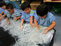 概念で教え込むのではなく、様々な技法での遊びを通して、混色の仕組みを発見していきます。糊絵の具の感触を楽しみながら少しずつ色を加え、変化を楽しみました。机いっぱいに描いた模様をロールペーパーに写し取ったときは大喜びでした。