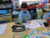幼児期の観察画は、形状や色彩を意識して描くことだけを目的にしているのではなく、モチーフから感じ取ったものをのびのびと表現することを大切にしています。名前をつけたり、手に乗せたりするなど十分に触れ合ったのち、お腹の模様や長いしっぽなど、印象に残った部分をデフォルメして個性たっぷりに描きました。