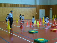 講演では、運動能力の発達停滞を防ぐために家庭で心がけるべきこと、親の意識についてなどお話していただき、子どもたちへは、バランス能力を高める運動や状況認知をしながら運動するプログラムを行っていただきました。