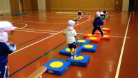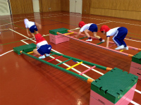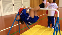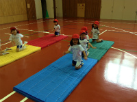 マット、とび箱、鉄棒、平均台、はしご、ツー・ディス、コーン、ボール、JPクッションなどの体育器具を組み合わせたり、いろいろな動きを連続して行ったりしていきます。