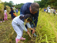 子どもたちだけでなく、マイケル先生も稲刈りに初挑戦しました。