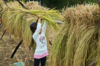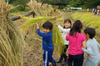 稲を刈り、その基部で縛って束ね、「稲架」にかける作業を子どもたちと一緒に、楽しんで取り組まれました。