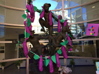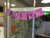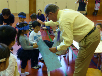 パーティーでは、来校いただいたマイケル先生に、年長児の代表の子どもが英語で感謝の気持ちを伝え、全員で作ったメッセージボードを渡しました。