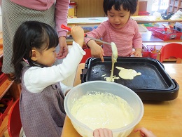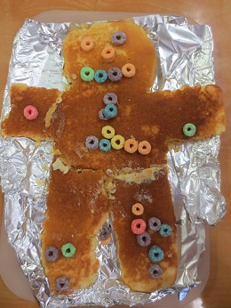ニューヨークドルトンの先生からの研修で学んだ「ジンジャーブレッドマン」の活動を2才児でも行いました。これは、創作・言語活動・マスマティックス・サイエンスなど様々な分野へ広がりを持たせながら、子ども達が楽しく取り組める活動のひとつです。この日は、クッキングでホットケーキを作る道具や材料を話し合いながら、大きなジンジャーブレッドマンを作りました。シリアルで目や口、ボタンをつけて出来上がり。「どこから食べる?」とお話もはずみ、おいしくいただきました。