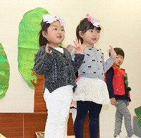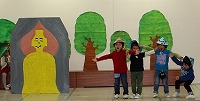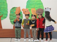 先日、年少クラスのお楽しみ会の劇がありました。「おむすびころりん」「大きなかぶ」「わらしべ長者」「三匹のこぶた」など、皆の良く知っているお話を劇あそびにしました。初めて舞台に上がって緊張していましたが、みんな嬉しそうで楽しく行なえました。