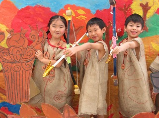 キンダーガーテン・H3クラスでは縄文時代のプロジェクトを行いました。縄文時代の衣食住について調べ、当時の洋服を自分達もつくったり、ガーデンに竪穴住居を再現したりしました。また、調べたことをエピソードに取り入れ、創作劇をおこないました。