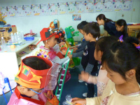 それぞれが好きなおばけに変身し、「トリック・オア・トリート」「お菓子をくれなきゃ、いたずらするぞ!」と唱えながら、各教室を回りました。