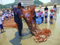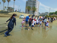 年中児と年長児が春の遠足に出かけ、愛知県南知多町の東浜海岸で「地引き網体験」をしました。