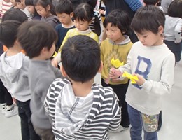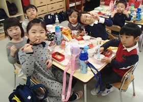 卒業を前に、プリキンダーガーテンとナーサリーからキンダーガーテンへ新しい門出をお祝いして、感謝の気持ちを伝える『お別れ会』が行われました。在校生から卒業生へは手作りのペンダントとチューリップをプレゼントし、また卒業生から在校生へは、4月からの役割となる誕生日会の司会ノートと鳩ぽっぽ体操のCDが託されました。お別れ会のあとは3学年一緒に給食を食べ、フリープレイをして名残惜しいひとときを楽しみました。
