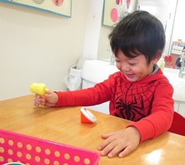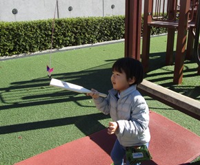 プレイグループ2才児では、お家の人とのお正月を思い出しながら、こま回しやたこあげ、はねつきなど、日本ならではのお正月の遊びを楽しみました。初めて経験する子も多いので、2才の子どもなりに興味を持って遊べるように工夫しています。こまは、はじめは苦戦していましたが、諦めずに何度も挑戦し、自分たちで回せるようになってきました。はねつきは、高いところからつるされた羽根を羽子板に当てて遊びました。子どもたちは羽根をよくねらって、タイミングを考えながら、羽子板を振っていました。