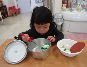 クッキングでは、お雑煮作りをしました。炊いたもち米を「ぺったんこ、ぺったんこ」と言いながらつぶし、野菜たっぷりのおつゆにいれていただきました。「おいしい。おもち、やわらかい!」と好評でした。また、創作活動でもハサミの活動やおままごとを取り入れながら、お雑煮を作りました。