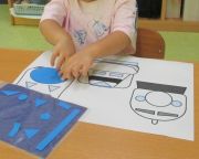 ロケットが飛び上がる動画を見た後に、ロケットが月まで飛んでいく噴射線を、壁に貼った画用紙いっぱいに描いたり、形に注目して新幹線の顔の模様を完成させたりと、幅広い活動を行っています。
