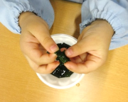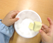 次に水を注いでしばらく置くと、あら不思議!大きくなったり、柔らかくなったり、ちぎりやすくなったり、子どもたちはいろいろと試しながら、変化していく様子をじっくり確かめていました。