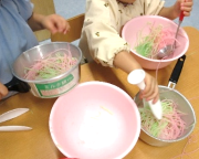 さらに、春雨を使い、ボウルや鍋、トングなどの調理道具を用意して、お料理ごっこも楽しみました。